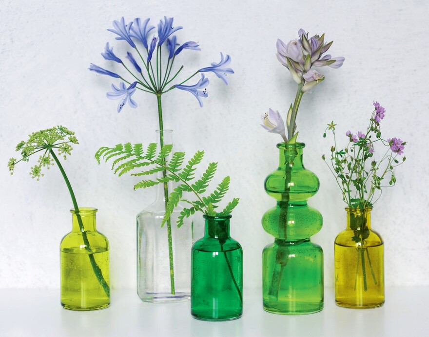 Szkło to surowiec magiczny. Można z niego wyczarować najbardziej wyszukane kształty. Równie nieograniczone są możliwości nadawania mu barw. Jego delikatność i kruchość to także atuty. Potencjał tego materiału można dostrzec, obserwując różnorodność form szklanych wazonów, flakonów, butelek, dzbanków czy słoików. Z zawartością czy bez zawsze przyciągają wzrok –  szczególnie ustawione tak, by filtrowały promienie słońca, blask świec czy światło sztuczne. To naprawdę sprawia, że te wszystkie naczynia ze szkła warto wykorzystać do eksponowania urody kwiatów. W parze z własną delikatnością, jak żadne inne podkreślą dyskretny urok oraz subtelność form roślin.